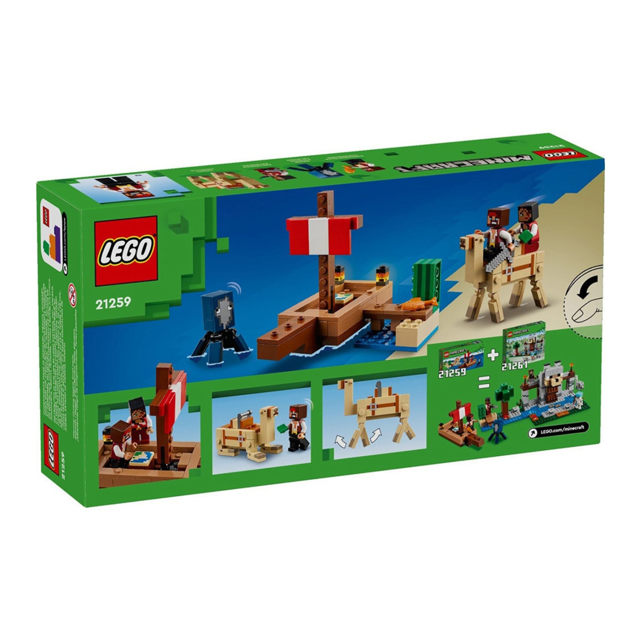 LEGO Minecraft The Pirate Ship Voyage (21259). Επάνδρωσε το πλοίο με 2 LEGO® Minecraft® πειρατές και άνοιξε πανιά για περιπέτειες στη διάπλαση της Ερήμου. Τι παραμονεύει μέσα στον νερό; Ένα καλαμάρι! Κατευθύνσου προς την ξηρά, όπου μπορείς να συμβουλευτείς τον χάρτη, σέλωσε την καμήλα και πήγαινε μια βόλτα προς την επόμενη, επική σου περιπέτεια Minecraft.